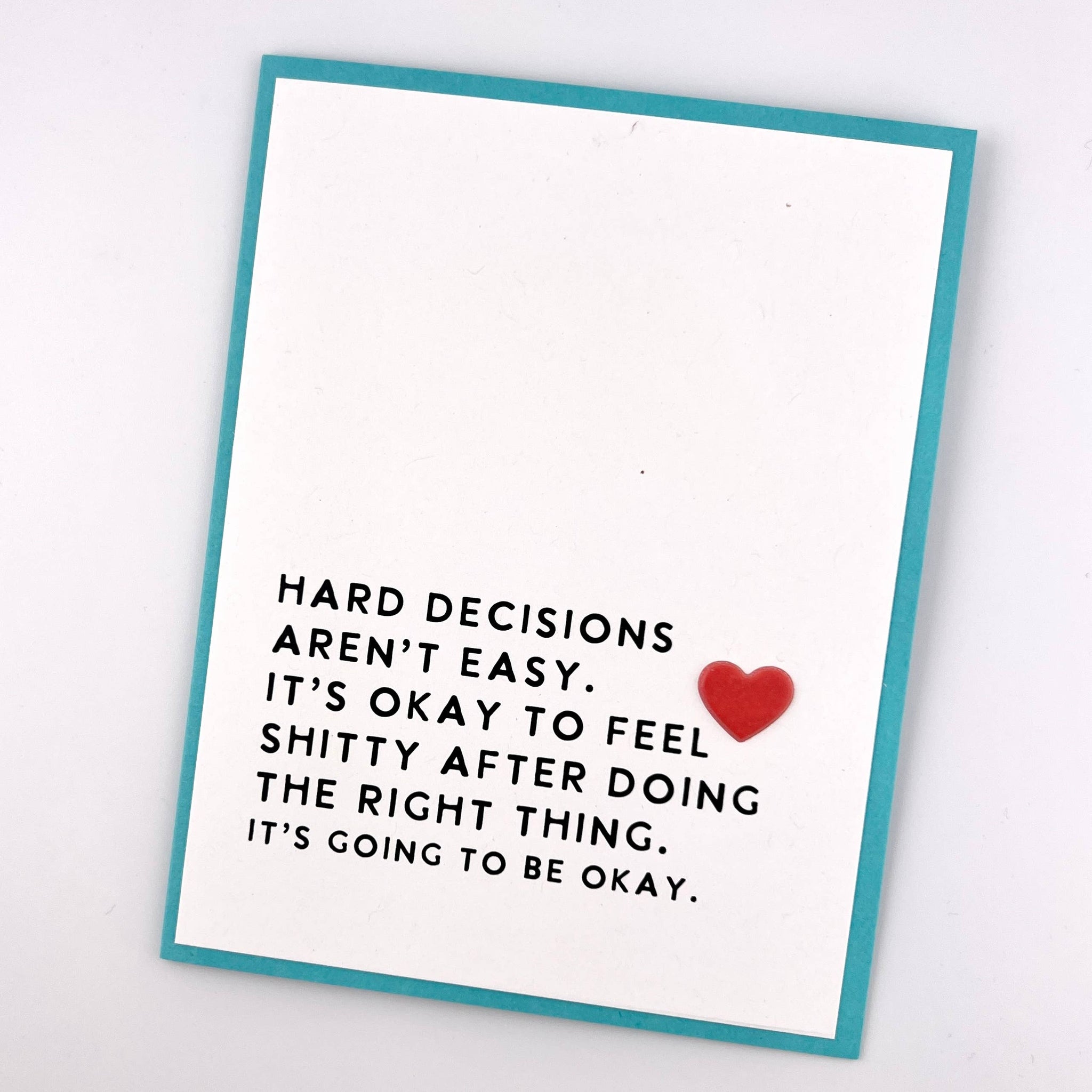Hard decisions aren’t easy. It’s okay to feel shitty after doing the right thing. It’s going to be okay. Each card is handmade with high quality acid-free cardstock using laser-printing, archival adhesive and embellishments. Cards are all blank inside and are shipped with a recycled envelope in an eco plant-based cellophane sleeve. [card size] 4.25 in x 5.5 in - A2 [envelope color] recycled kraft brown [envelope size] 4.375 in x 5.75 in - A2 [material] paper [inside] blank
