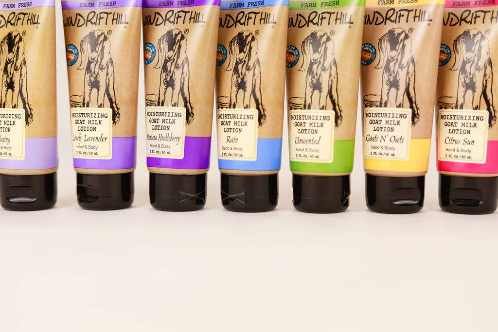 A blend of french lavender, fir pine, Egyptian jasmine, pure vanilla softened with delicate musk. A top-selling, signature scent. Our travel-friendly 2 oz hand and body lotion is packaged in a convenient tube! Our same amazing goat milk formula that you have come to love, now in a convenient size! Do not leave home without one! Our goat milk lotion formula uses the goodness of pure goat milk to replenish moisture to your skin. It absorbs quickly, will not plug pores, and leaves the skin silky smooth. Its light, non-greasy texture makes it ideal for use under makeup. (*unscented is recommended for the face if you have sensitive skin.) Ingredients: water, goat milk, jojoba, vegetable emulsifying wax, vegetable glycerin, fragrance oil, optiphen. Handmade in Montana, USA. Size: 2 oz.
