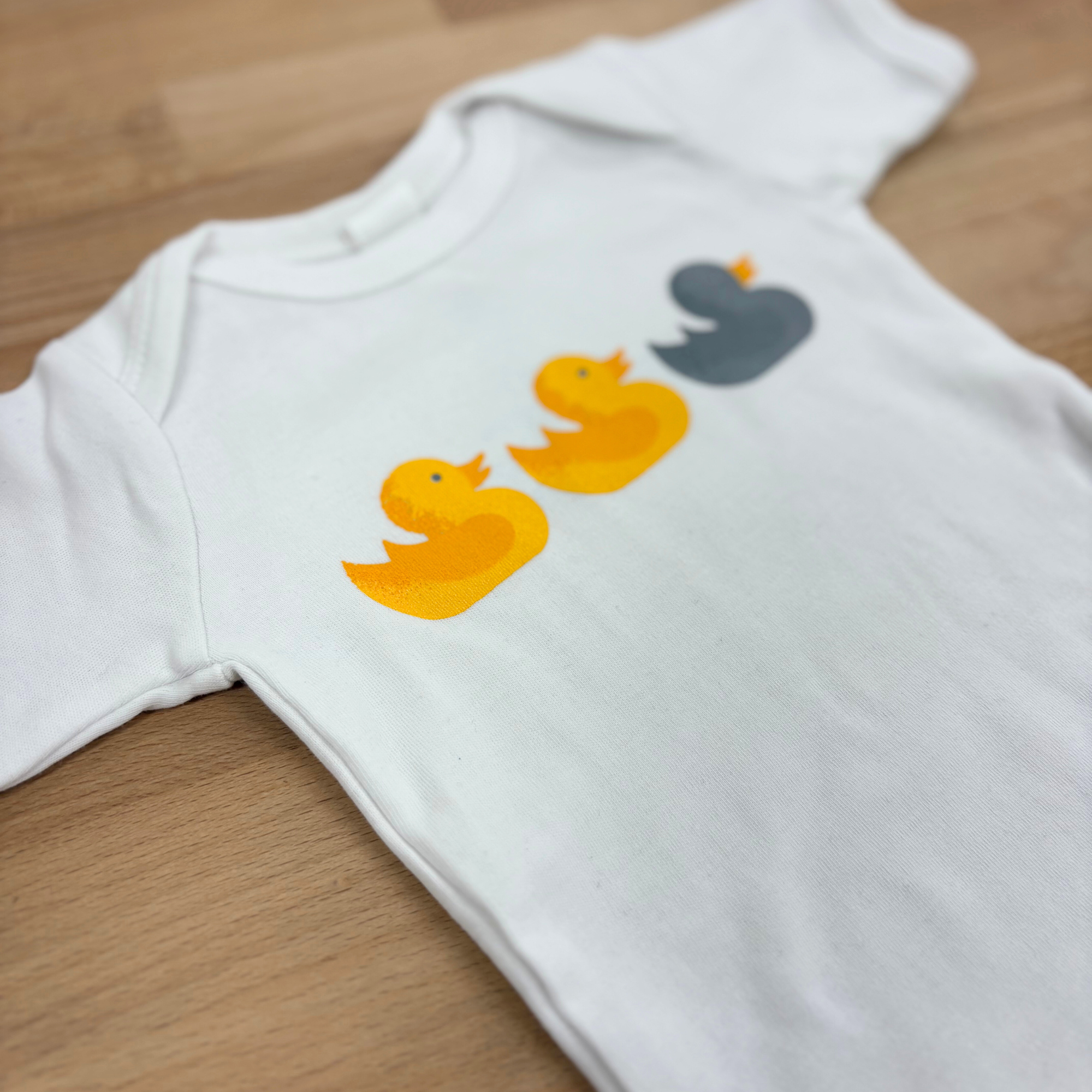 Each bodysuit is professionally hand screen printed using vibrant gray, yellow, and orange lead and phthalate-free inks that holds up wash after wash.
